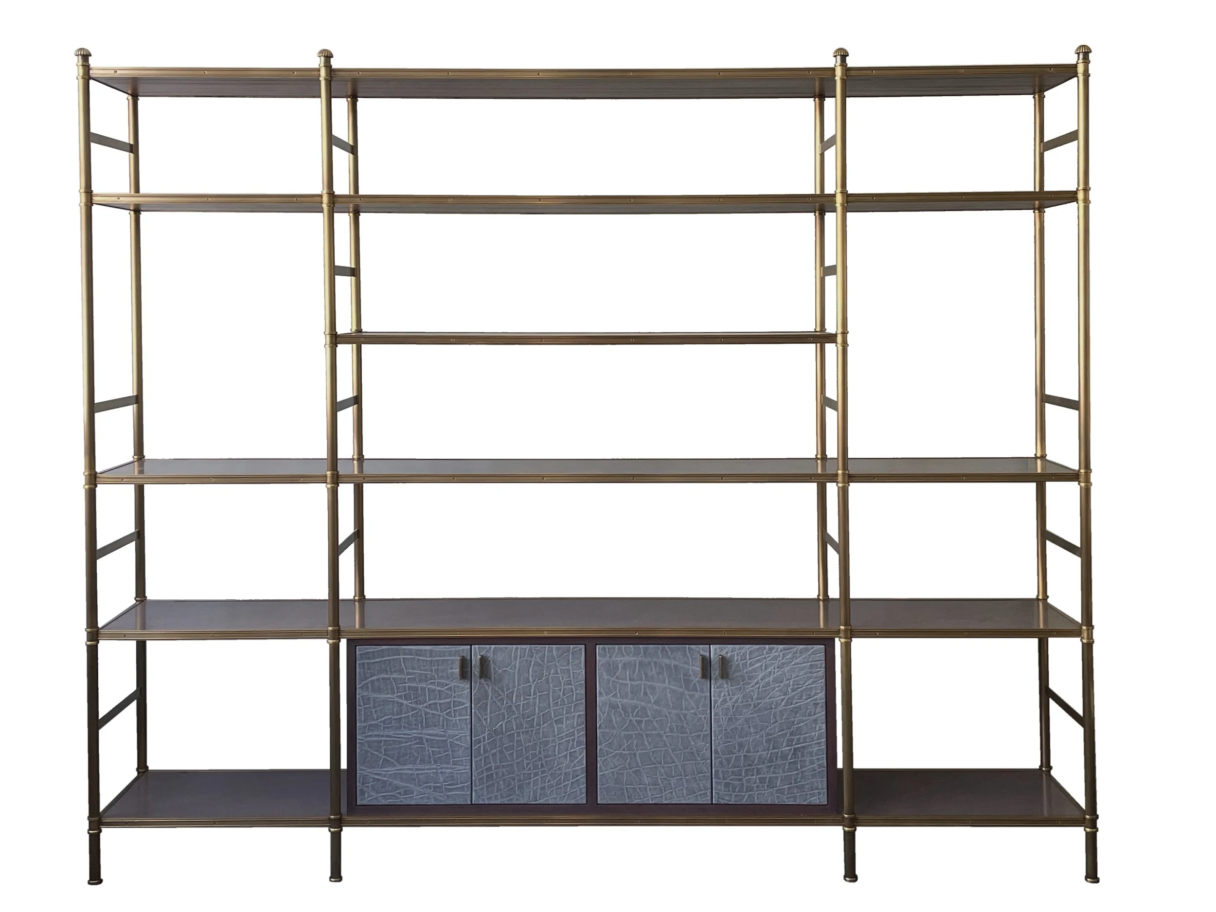 Custom made Etagere with leather covered doors of mahogany cabinet and patinated brass frame by Victoria & Son.